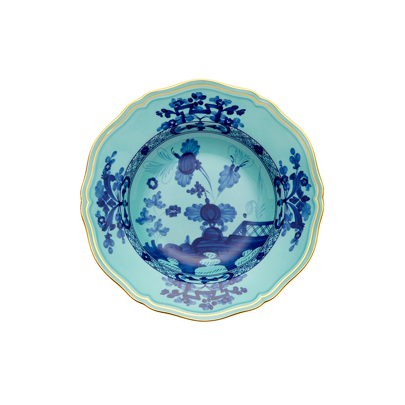 Unterglasiertes und verglastes Porzellan. Spülmaschinenfest. Oriente Italiano Kollektion auf Antico Doccia Form, wo Airbrush und Farbphantasie ein wunderbares dekoratives Gewebe schaffen. Abmessungen: Durchmesser 24 cm.