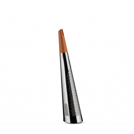 Die Reibe „Todo“ ermöglicht dank des außergewöhnlichen Hubs des langen Kegelstumpfkörpers die Herstellung der für jedes Gericht erforderlichen Käsemenge in einem einzigen Durchgang. Ein hervorragendes Beispiel für ein Präsentationsobjekt auf dem Tisch oder in der Küche, aber gleichzeitig mit einer präzisen und innovativen Funktionsleistung, die einen der langweiligsten und am wenigsten qualifizierenden Kochvorgänge fast in spielerische Gesten verwandelt. Höhe 46cm.