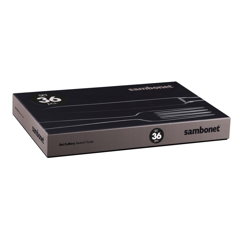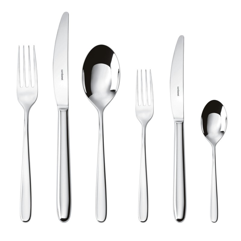 Set composto da: 6 forchette tavola, 6 coltelli tavola monoblocco, 6 cucchiai tavola, 6 cucchiai te', 6 forchette dessert, 6 coltelli dessert monoblocco.