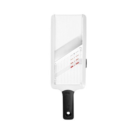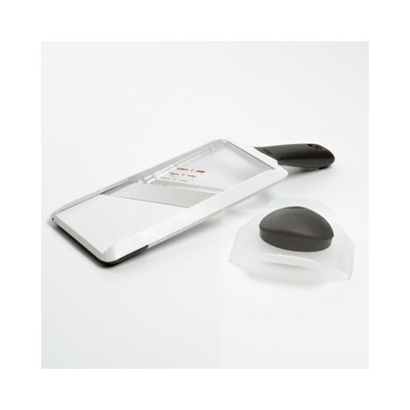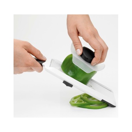 Affetta verdure manuale. Tre impostazioni di spessore delle fette. Impugnatura antiscivolo e manopola proteggi dita. Finestra trasparente mostra le fette create. Fori sull’impugnatura per poterla anche appendere in cucina. Lavabile in lavastoviglie sul cestello superiore. Dimensioni: 28x9,8x4,5 cm.