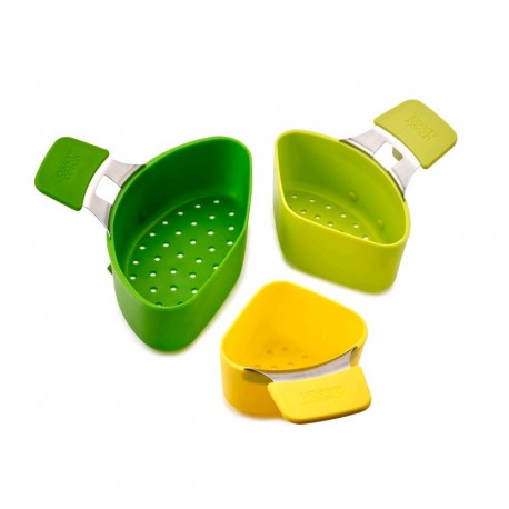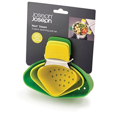 Dimensioni: 5,5x7x13 cm. Per cucinare contemporaneamente 3 cibi differenti nella stessa pentola. Aggancio alla pentola integrato. Design salvaspazio. Utilizzabile con pentole di diametro minimo di 18 cm per utilizzo del set al completo; profondità minima della pentola 8 cm.
