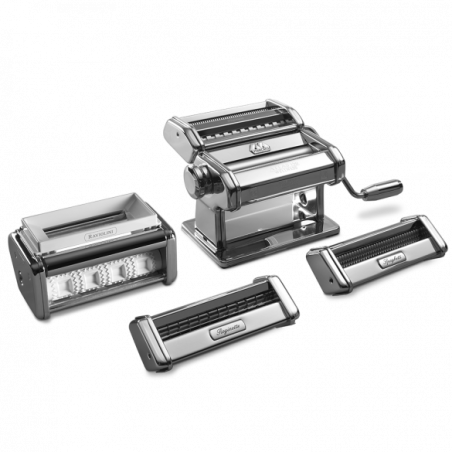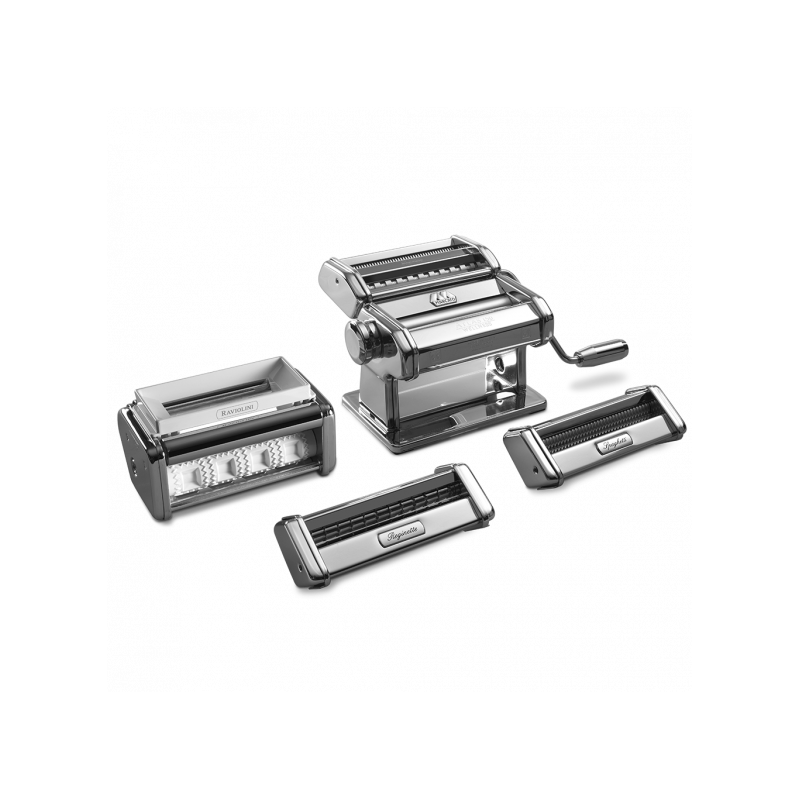 Una macchina, sei formati di pasta! Il set perfetto per i professionisti della pasta fresca fatta in casa. Multipast include una macchina per pasta Atlas 150, con accessorio per fettuccine e tagliolini, e tre accessori extra per spaghetti, reginette e raviolini.