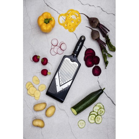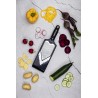 La lama Julienne produce anche, strisce lunghe e sottili. Pratica custodia di lama julienne. Telaio in acciaio inox per una durata superiore quando affetta. Supporto cibo incluso per facilità d'uso e sicurezza. Impugnatura ergonomica soft-touch. Lavaggio a mano consigliato