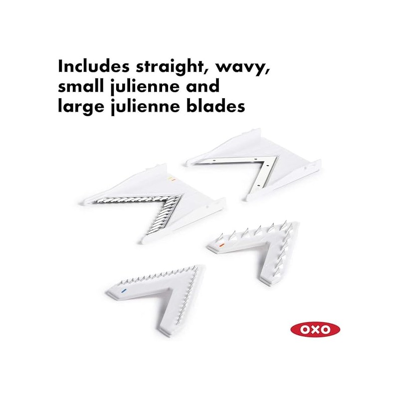 La mandolina OXO e' lo strumento perfetto per creare sensazioni gastronomiche rapidamente e facilmente. Tutte le lame sono coperti in modo sicuro quando non in uso. Una maniglia morbida impostata più bassa rispetto al corpo garantisce una presa comoda e mantiene la mano fuori strada , e in largo , piedini antiscivolo mantenere la Mandoline stabile e sicuro sul piano di lavoro . Il titolare cibo grande detiene il cibo in modo sicuro , protegge le dita e ha una impugnatura morbida per il massimo comfort . Lo storage è un gioco da ragazzi : tutte le lame conservare a bordo per una maggiore sicurezza e comodità , le gambe si piegano compatto , e il titolare cibo scatta sotto. Tutte le lame sono facilmente rimovibili per la pulizia.
