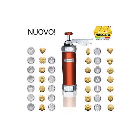 Biscuits, della linea Marcato Design, è la simpatica macchinetta per fare i biscotti in casa. È disponibile in argento, blu, nero, rame, rosa, rosso e verde. Biscuits dispone di 20 trafile per ottenere altrettante forme di biscotti, una per ogni occasione dell'anno. Con questa macchinetta puoi creare biscotti da decorare o riempire a piacere, secondo il tuo gusto personale.