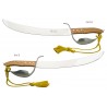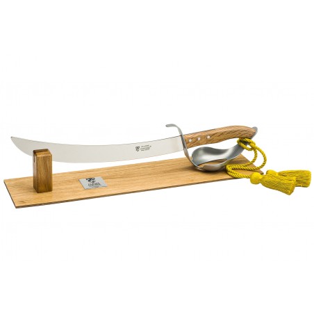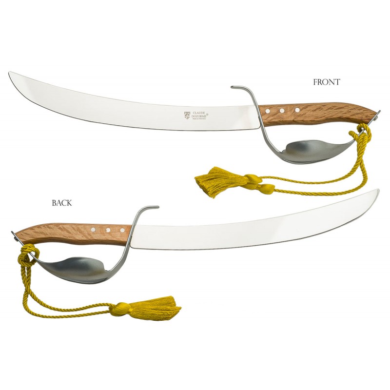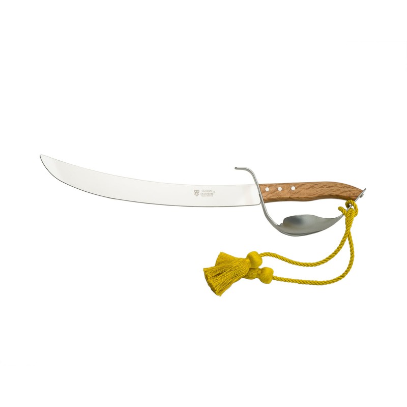Sciabola per champagne Claude Dozorme - Laguiole. Lama forgiata in acciaio inox e manico in legno chiaro. Confeizone singola con elegante base in legno.
