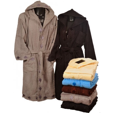 Accappatoio in 100% cotone, morbido e asciuga rapidamente, con ricamo su tutta la balza. Disponibile in vari colori. Taglie: S-M-L-XL-XXL. Peso: 450g/m2