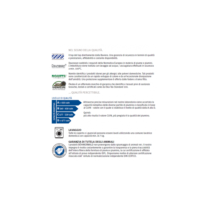 L'esclusivo tessuto delle fodera, le piume e il piumino selezionati, nonchè l'accurata lavorazione, assicurano una lunga durata a questo capo. Le sue caratteristiche inconfondibili, quali la leggerezza, il calore gradevole e la regolazione dell'umidità vi arrecheranno una gradevole sensazione di benessere garantendovi un sonno naturale assicurandovi il comfort climatico durante il riposo. Per impedire che il piumino possa spostarsi, i piumini vengono suddivisi in riquadri e il calore in eccesso si disperde attravreso le cuciture prevenendo un eventuale ristagno sotto il piumino. Daunasan soddisfa i requisiti della Normativa Europea in materia di piume e piumini. L'imbottitura viene trattata con lavaggio ad acqua / asciugatura effettuati in sicurezza a min. 100°C. Ökotex è un affermato marchio di garanzia che identifica i tessuti privi di sostanze tossiche, testati e certificati come da Öko-Tex Standard 100. Il top del top direttamente dalla Baviera. Una garanzia di sicurezza in termini di qualità, prestazioni, affidabilità e costante disponibilità. Nomite identifica i prodotti idonei per gli allergici alle polveri domestiche. Tali prodotti sono caratterizzati da un rapido sviluppo di calore e da un'eccezionale dissipazione dell'umidità. Una protezione supplementare è offerta dalle fodere a trama fitta. Istruzioni per il lavaggio: - lavaggio in acqua delicato a temp. max 40°C - trattamento al cloro non consentito - stiratura non consentita - lavaggio a secco delicato con percloretilene - asciugatura delicata in tamburo consentita.