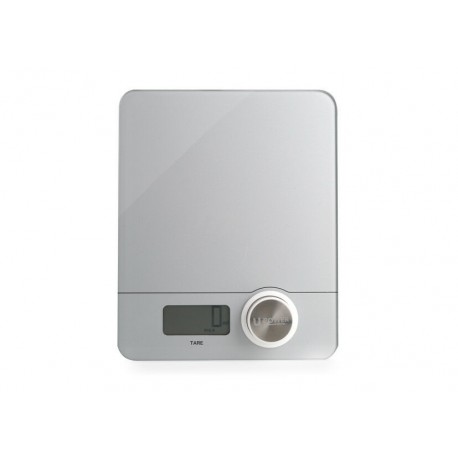 Bilancia elettronica da cucina in acciaio inox: piattaforma in acciaio inox, con rivestimento anti-impronte, display LCD 55x23.3mm retroilluminato blu, selettore: g. Dispositivo tara azzeramento e spegnimento automatici indicatore batterie scariche funzione timer e funzione orologio portata: 5 kg suddivisione: 1 g alimentazione: 3 batterie alcaline AAA non incluse. Misure: 21,5 x 15,5 x 1,7cm