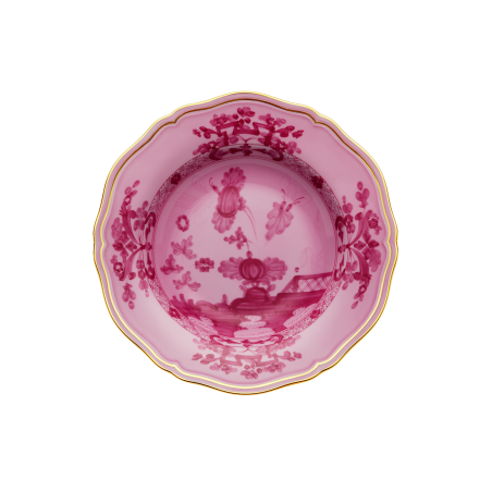 Porcellana sottosmalto e vetrificata. Resistente alla lavastoviglie. Collezione Oriente Italiano sulla forma Antico Doccia dove aerografo e fantasia del colore creano un meraviglioso intreccio decorativo. Dimensioni: diametro cm 24.