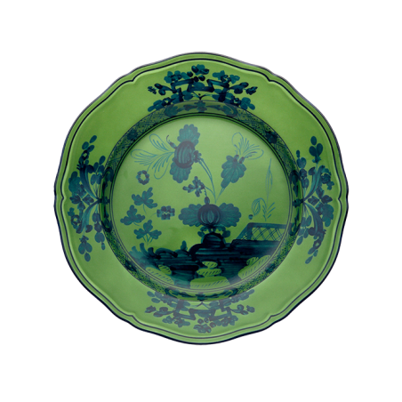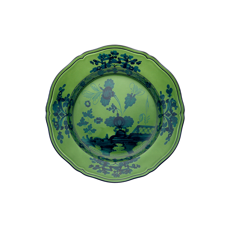 Porcellana sottosmalto e vetrificata. Resistente alla lavastoviglie. Collezione Oriente Italiano sulla forma Antico Doccia dove aerografo e fantasia del colore creano un meraviglioso intreccio decorativo. Dimensioni: diametro cm 26,5.