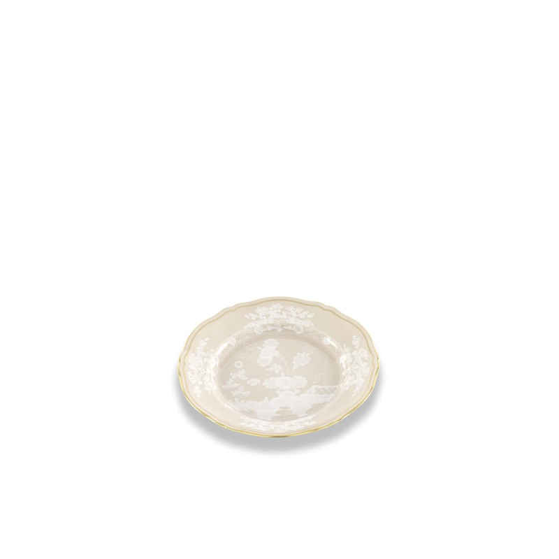 Porcellana sottosmalto e vetrificata. Resistente alla lavastoviglie. Collezione Oriente Italiano sulla forma Antico Doccia dove aerografo e fantasia del colore creano un meraviglioso intreccio decorativo. Dimensioni: diametro cm 21. Piatto piano in porcellana con decoro Meringa e filettatura oro. Collezione Oriente Italiano.