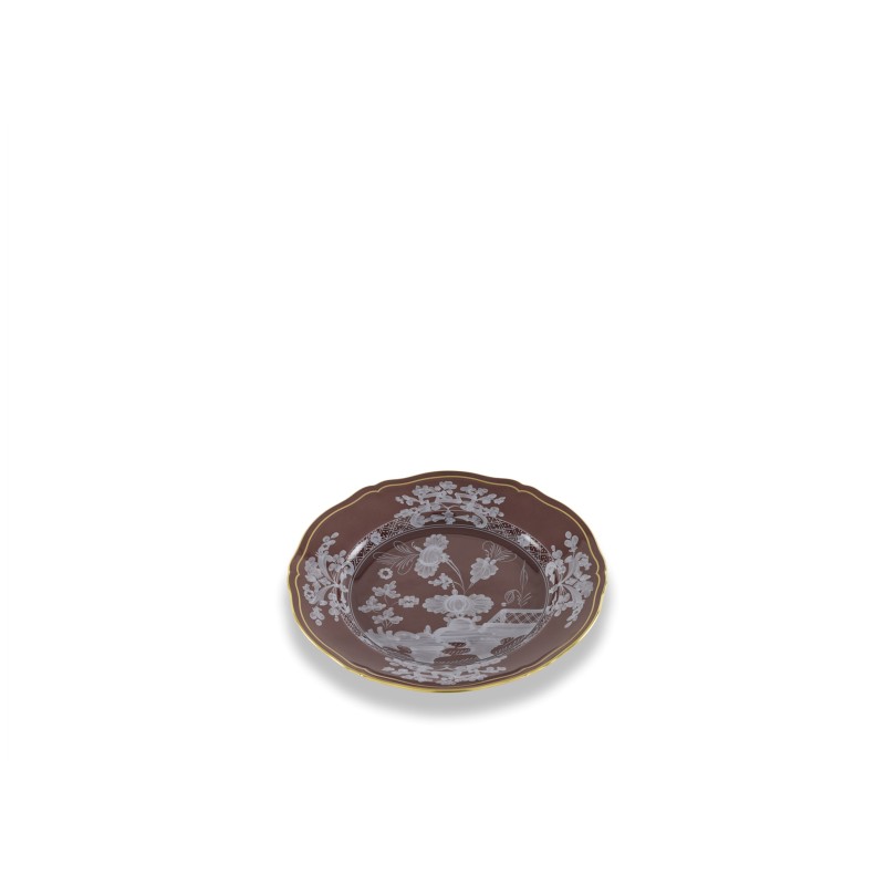 Porcellana sottosmalto e vetrificata. Resistente alla lavastoviglie. Collezione Oriente Italiano sulla forma Antico Doccia dove aerografo e fantasia del colore creano un meraviglioso intreccio decorativo. Dimensioni: diametro cm 21. Piatto piano in porcellana con decoro castagna e filettatura oro. Collezione Oriente Italiano.